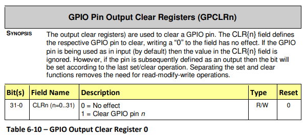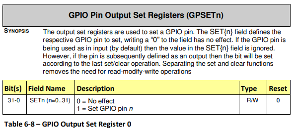 address 0x7E20 0000 부터 gpio register는 시작하며 각 레지스터 마다 Field Name이 있으며 Field Name으로 레지스터에 설명되어 있다.